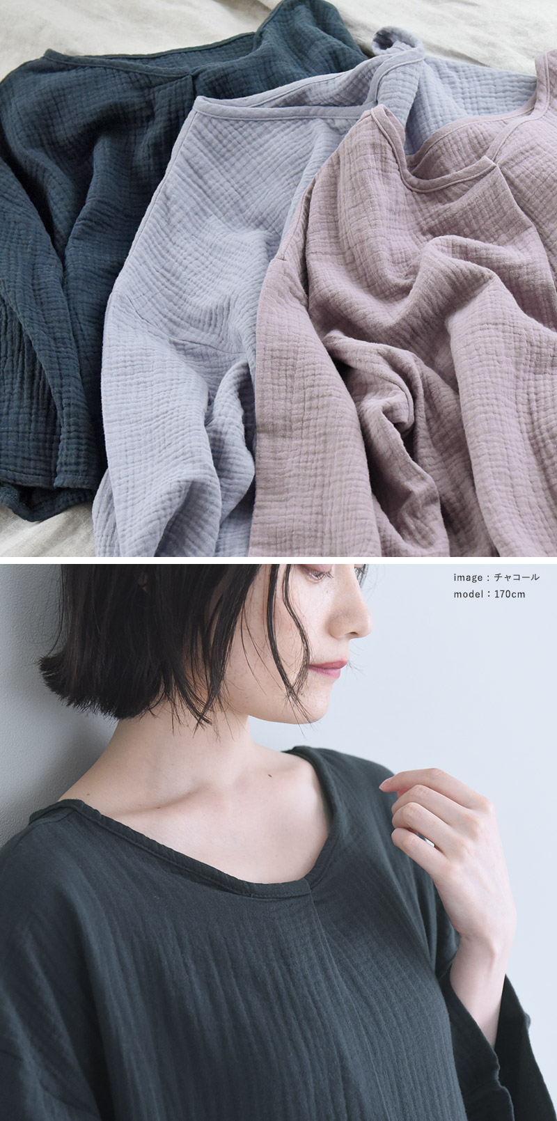 寒い季節に着やすい7分袖バージョンで、素材はふっくらとやや厚みのある3重ガーゼを採用。