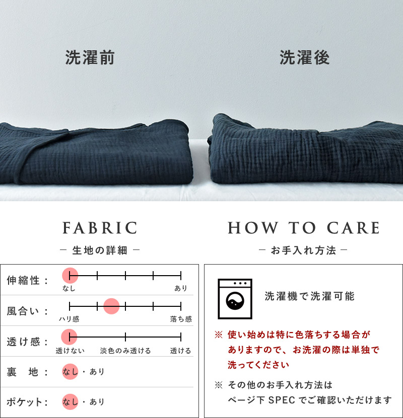また、ガーゼ素材は使い込むほどに育つ素材。最初はややハリ感がありますが、洗濯を繰り返していくうちに柔らかくなっていきます。着るたびに増していくふんわり感をお楽しみください。