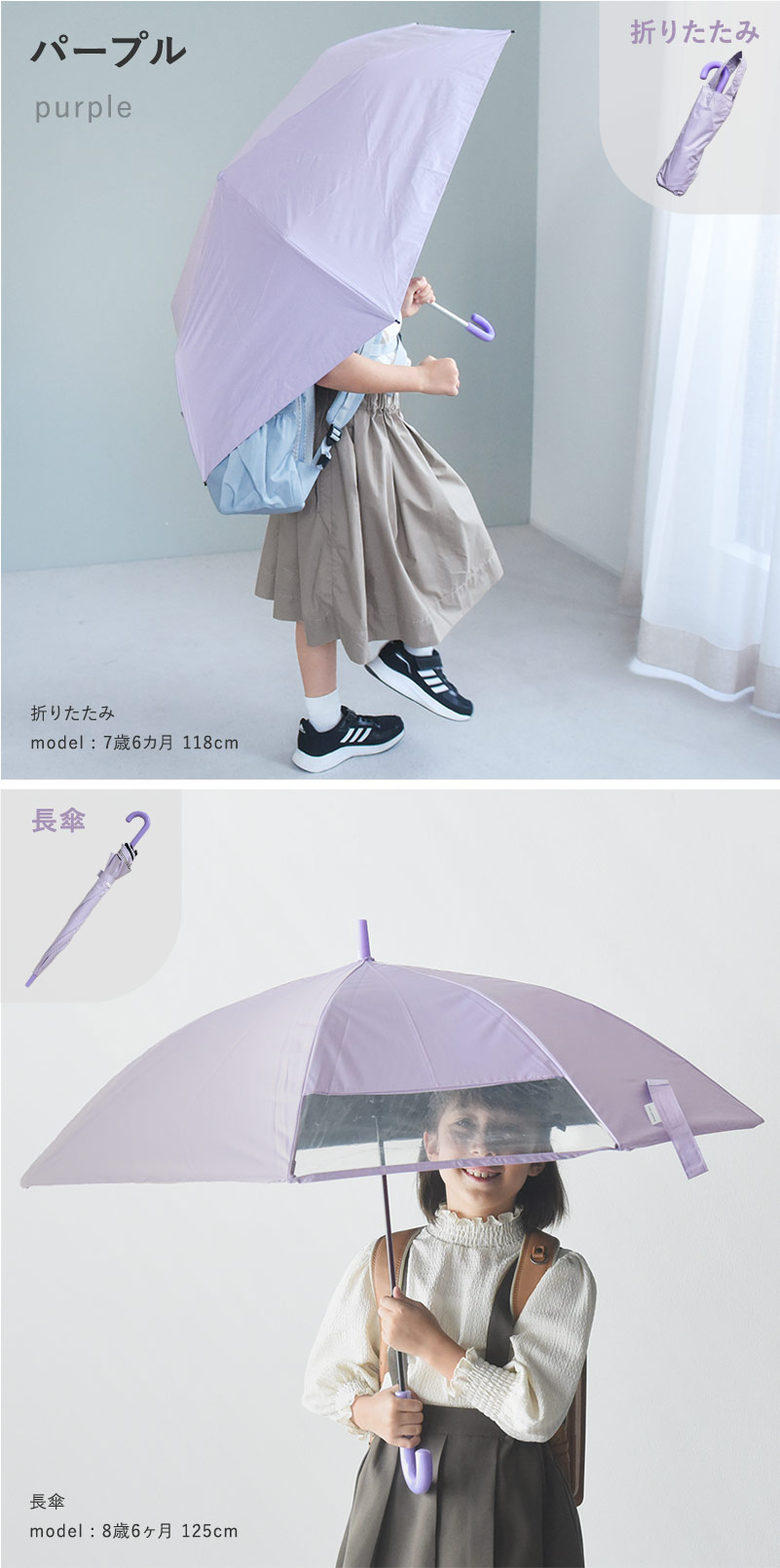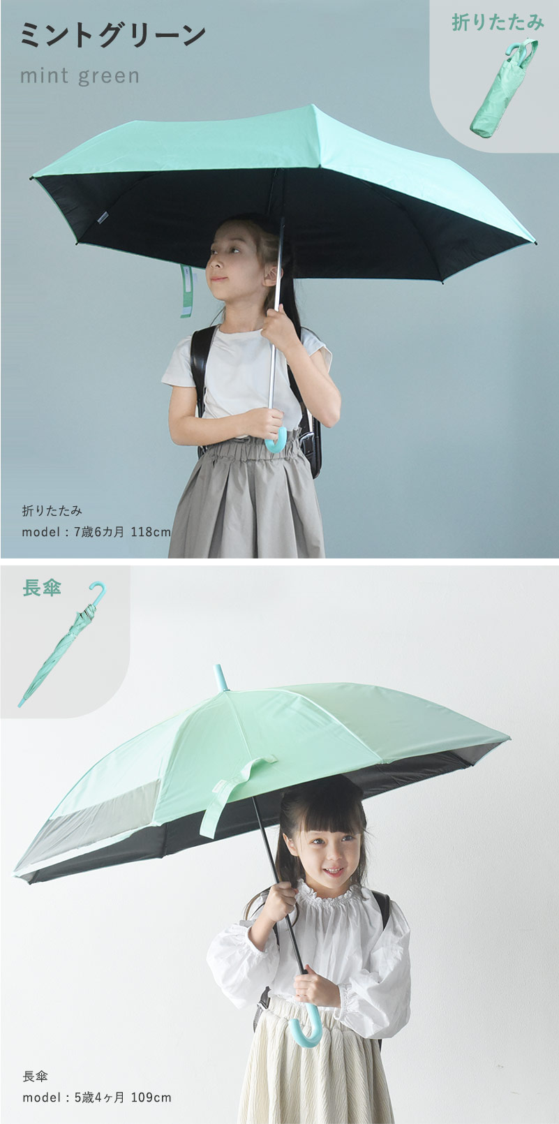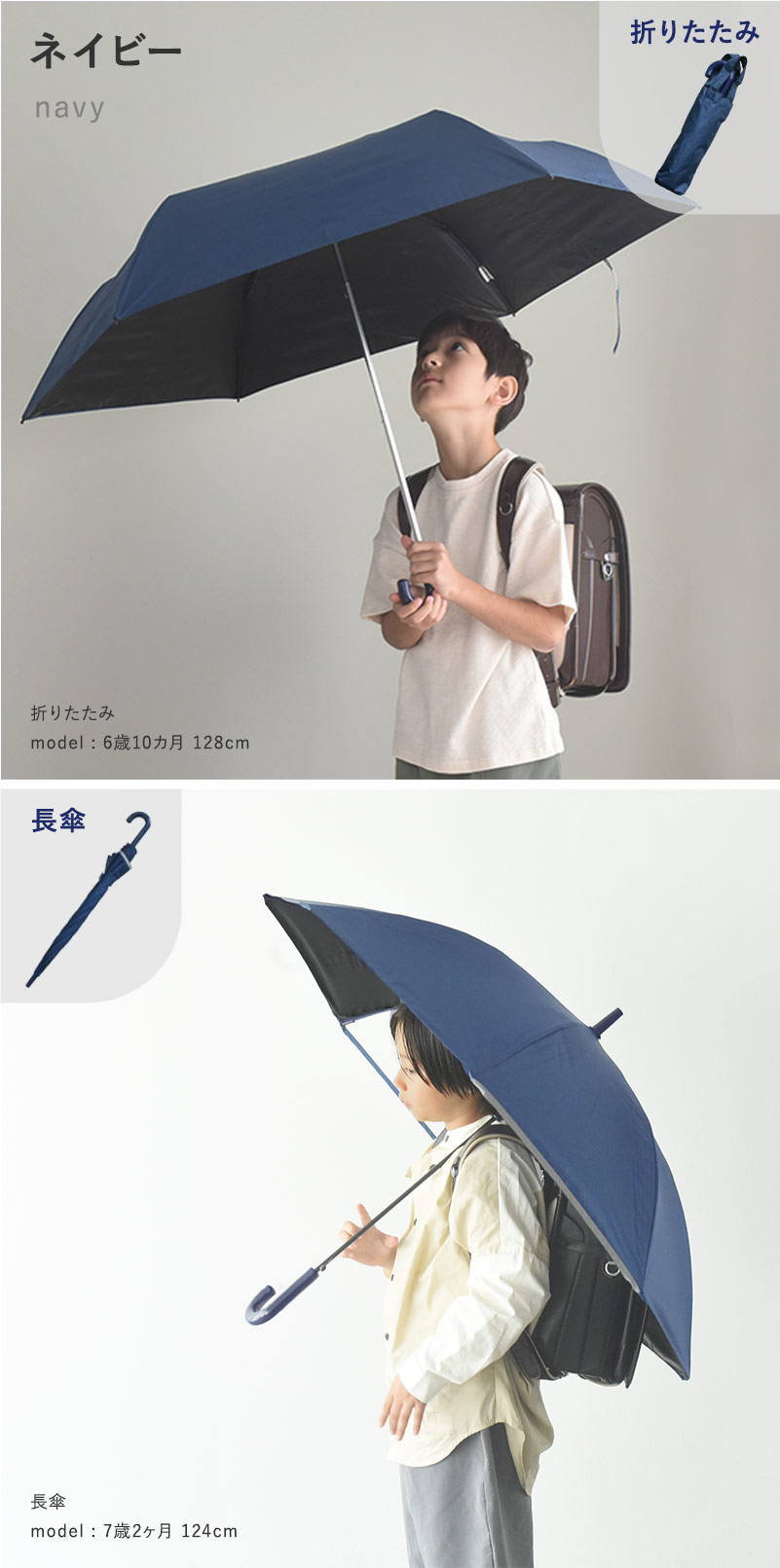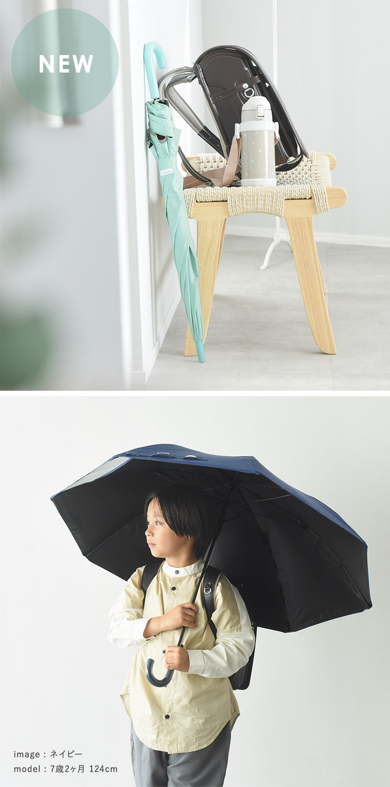 - UVカット率、遮光率ともに99%以上の子ども用の折り畳み日傘と長傘。遮熱効果もあるので、登下校の熱中症リスクを減らせます。撥水加工も施してあるので、雨傘としても使えます。