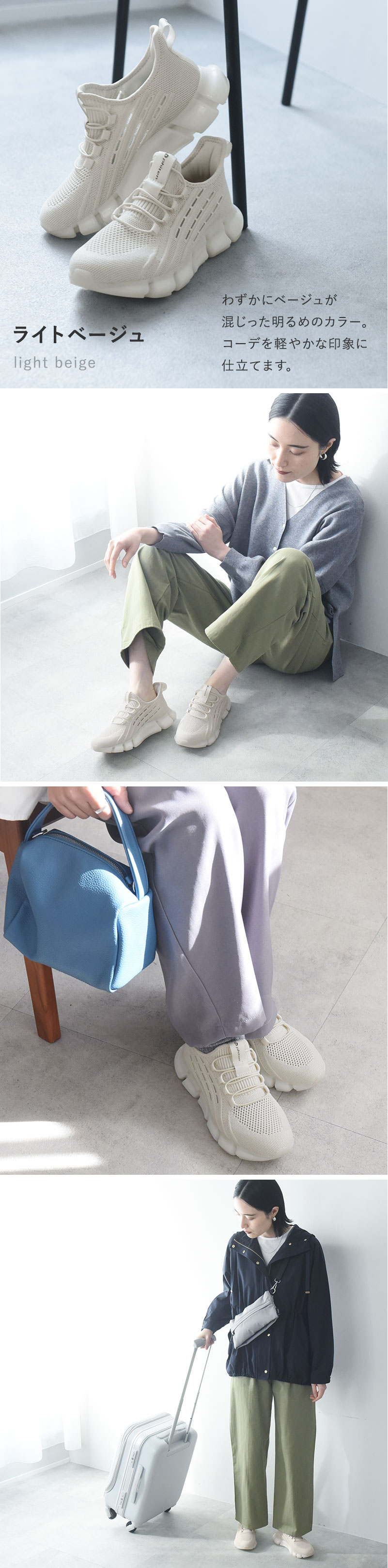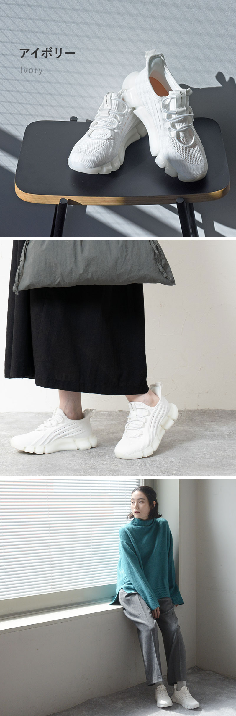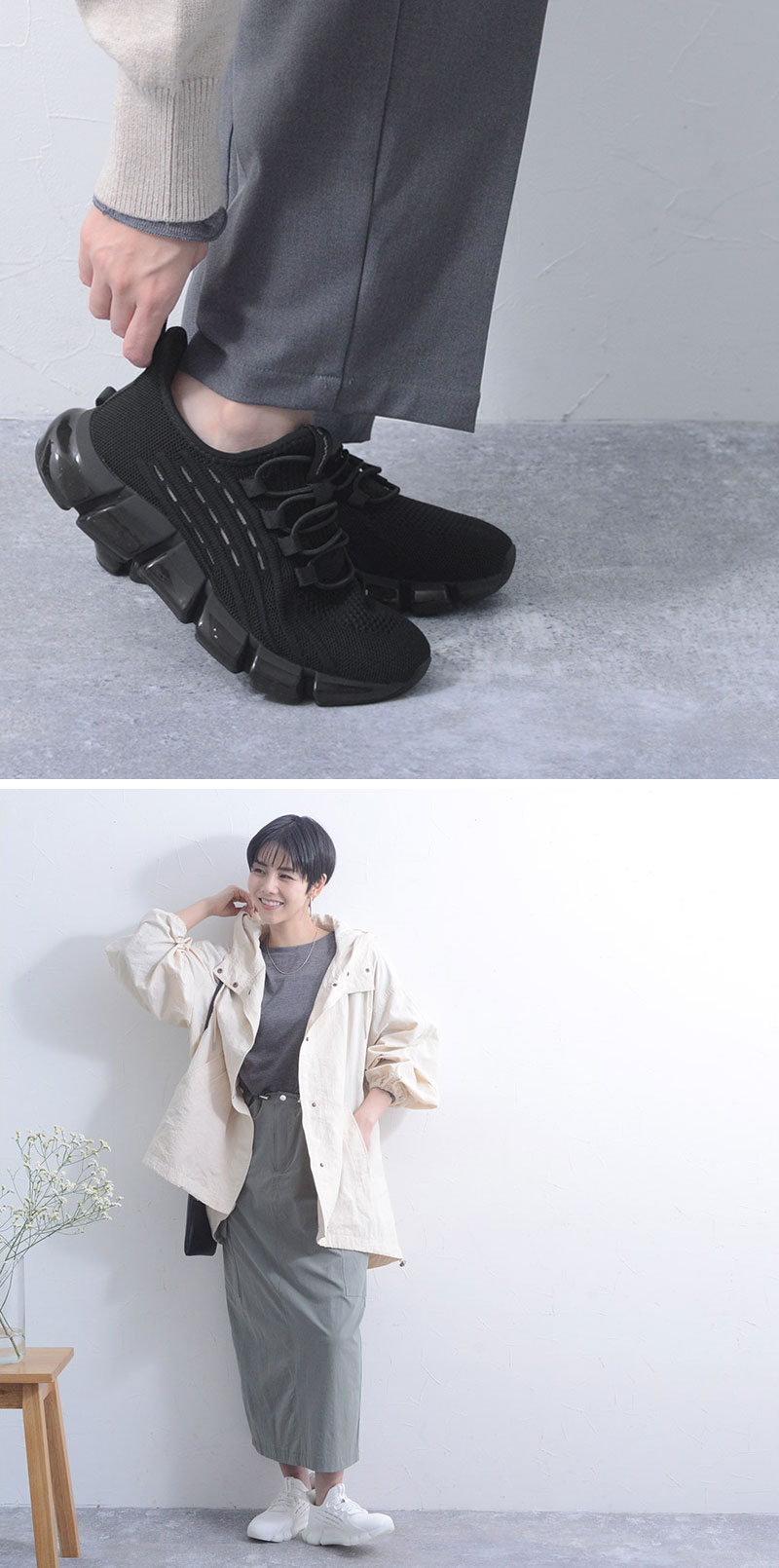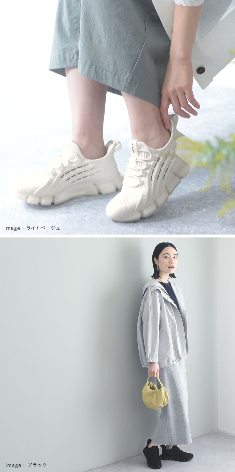 快適なニット素材伸縮性のあるニット素材で足にフィット。通気性も抜群で蒸れにくく、快適な履き心地を実現しています。