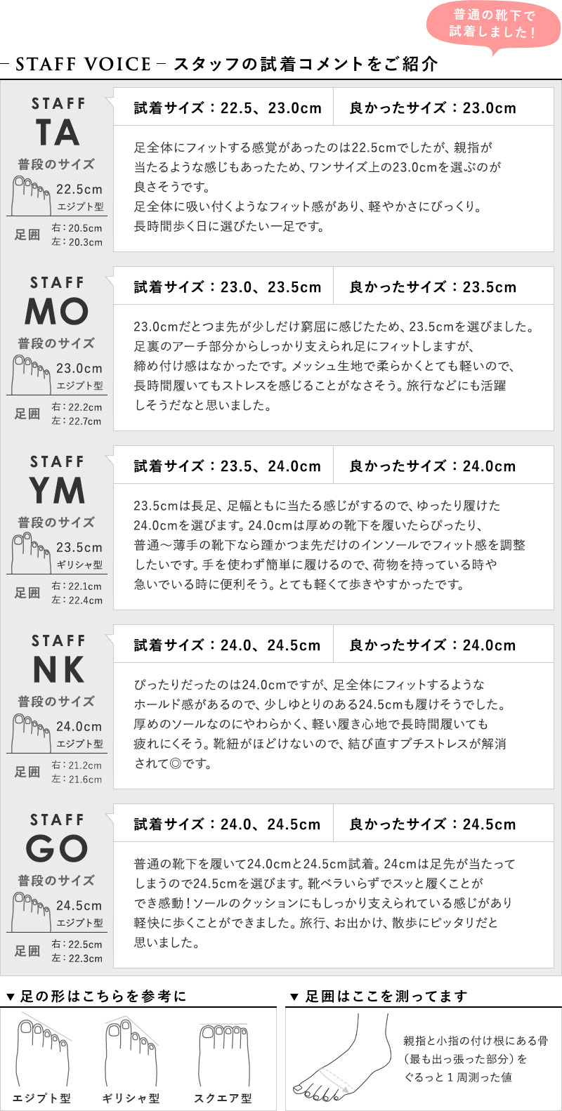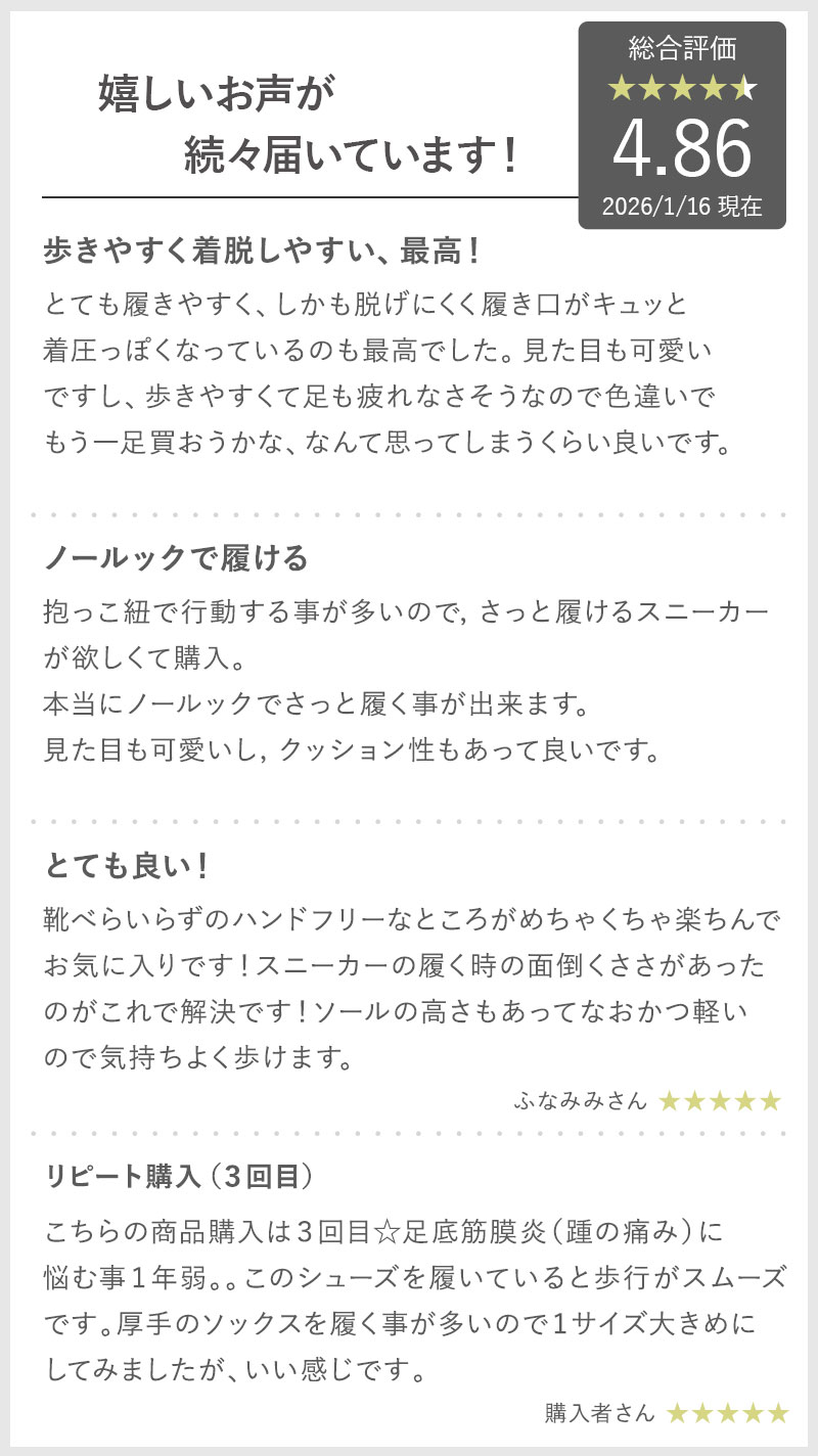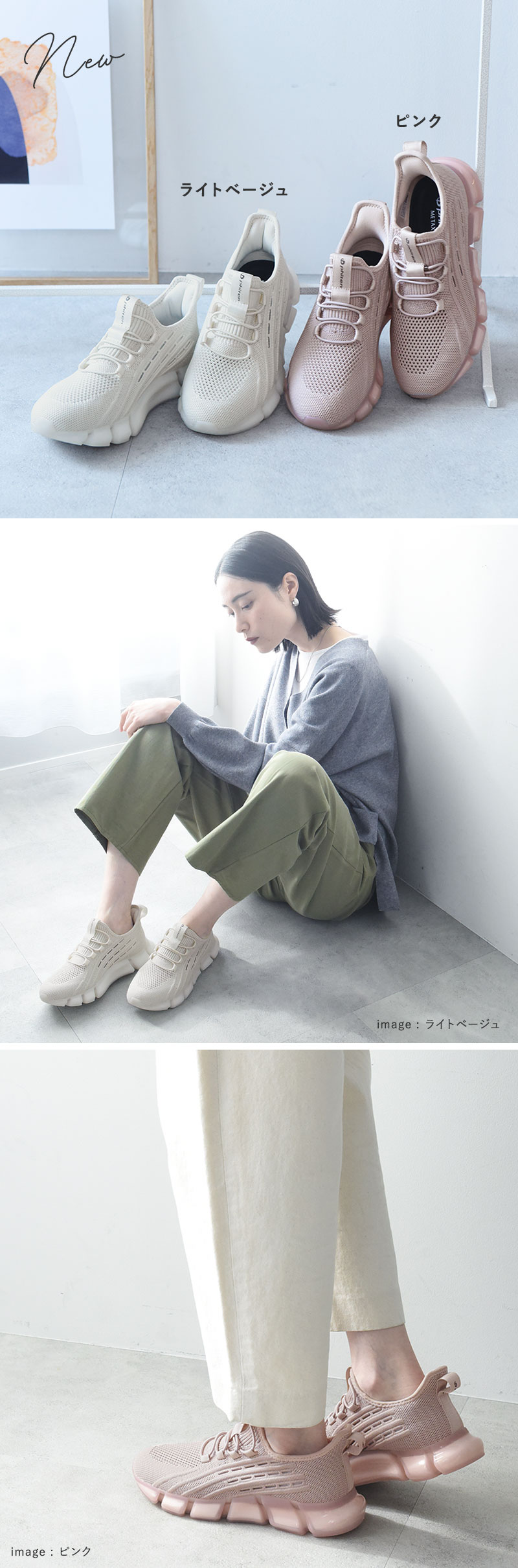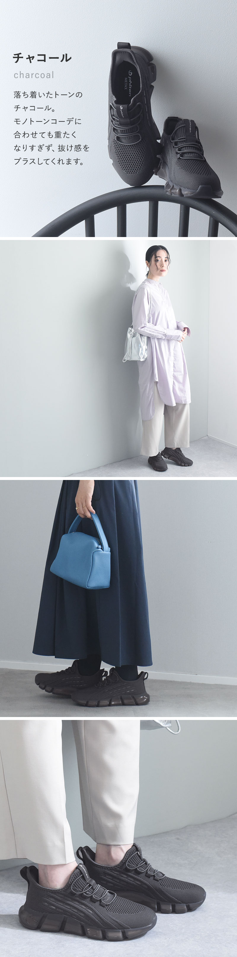 かがまずスポっと履けて、そのまま走り出したくなるような軽やかさ。一日中歩き回っても疲れにくい、その履き心地にヤミツキ必至です。