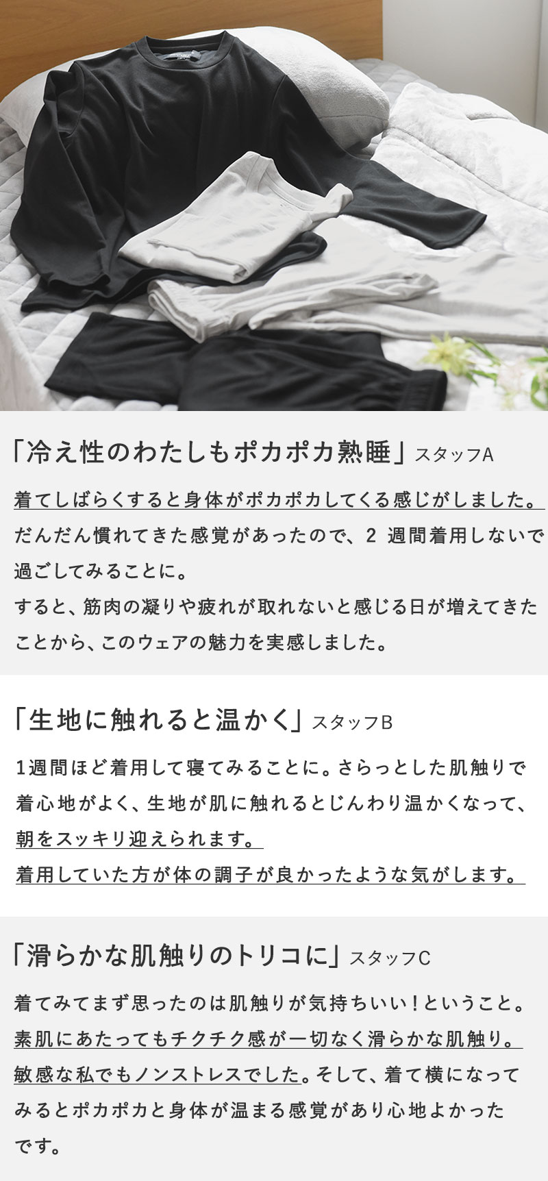 主に睡眠時やスポーツ後に着用され、睡眠環境の質を高めることが期待できる高機能ウェアです。