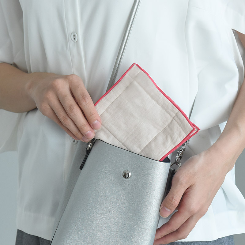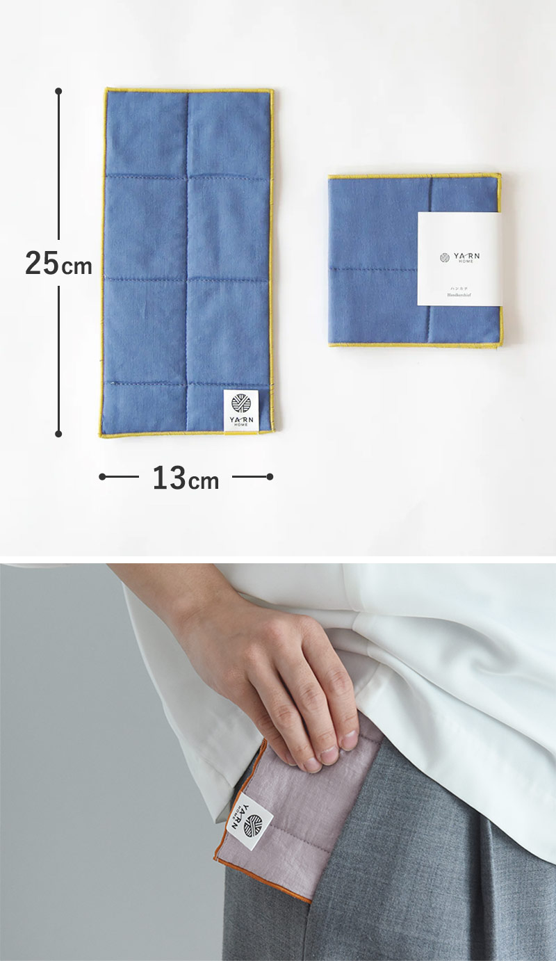 ポケットやバッグインバッグに入れてもかさばらず、さっと取り出せるハーフサイズのハンカチ。25×13cmの長方形は、持ち運びしやすく手のひらにちょうどフィットするサイズです。