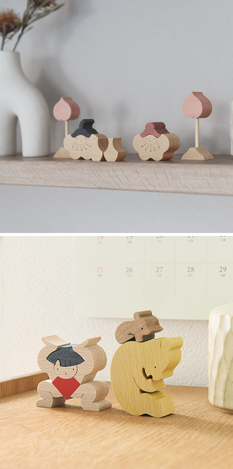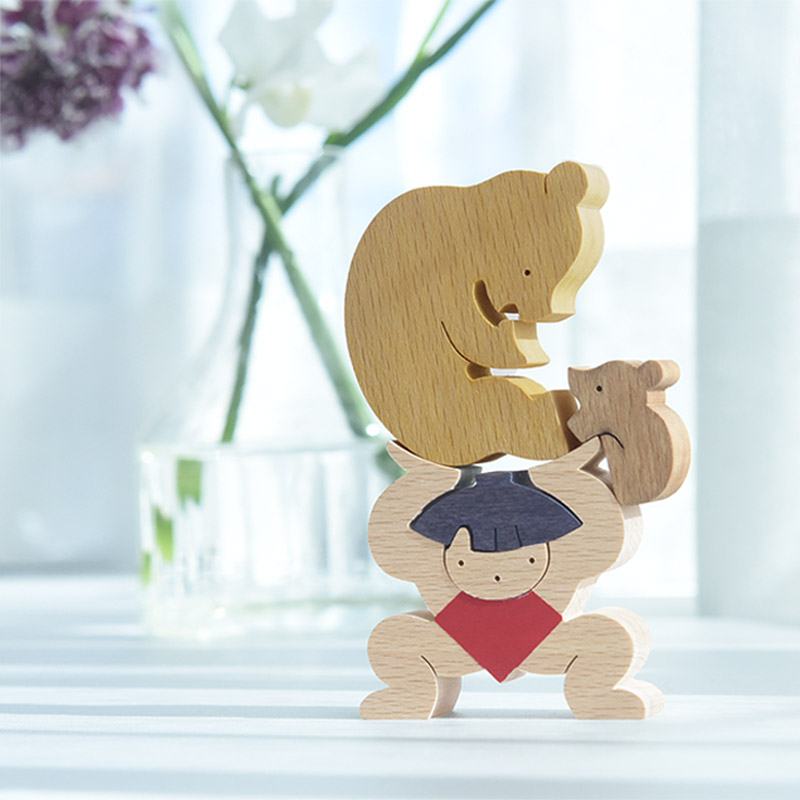 五月人形の定番、金太郎がクマの親子を持ち上げている組み木。積み上げたり、逆さまにしてみたり、さまざまなレイアウトでお話をつくるのも楽しそうです。