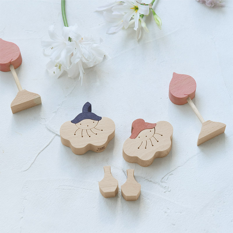 その昔、ひな人形は“ひいなあそび”として子どもたちが手にとって遊べる道具でもあったそう。 今では厳かな雰囲気をまとっていますが、「昔のように気軽に子どもたちが手に取れたら。」そんな想いから生まれたのが、小黒三郎さんの組み木人形です。