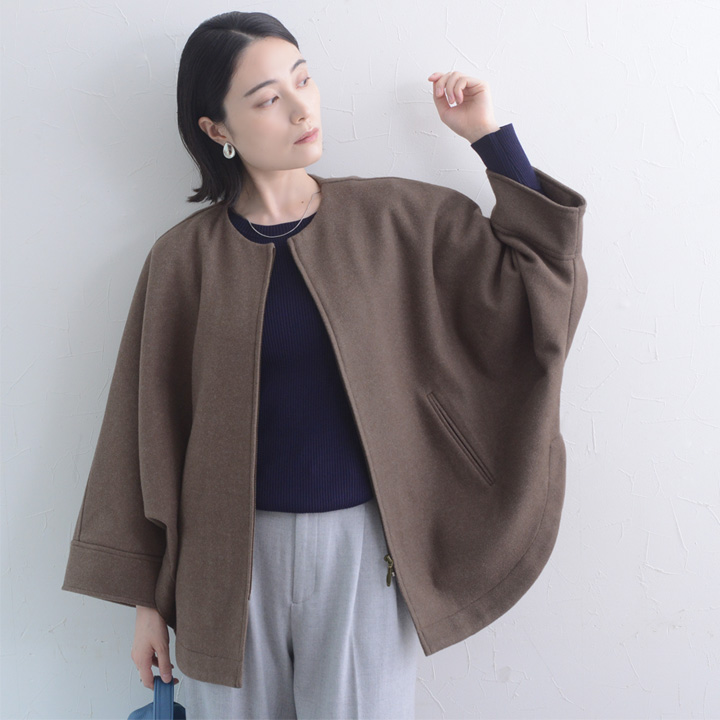 ドルマンスリーブでゆったり着られる ウールライク ポンチョ風ジップコート/Agreable アグレアーブル【送料無料】