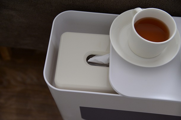 ティーカップなどを置いたトレイの下はちょっとした収納に。良く使うティッシュボックスやリモコンなどをまとめて収納!なんてこともできますよ。