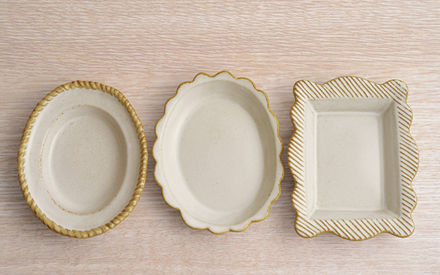 日々の食卓に使ってほしいから。使い手への思いやりも込められています、目が細かい土から作られたうつわは、強度が高く、汚れが付きにくいのも特徴。縁どりの金彩は電子レンジにも対応しているのも嬉しいポイントです。