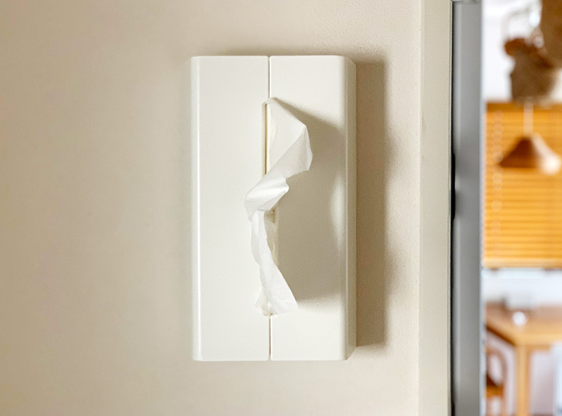 ideaco「ティッシュケース ウォール」は壁にしっかり設置できるから、急いでいる時も片手で簡単にティッシュに手が届きます。