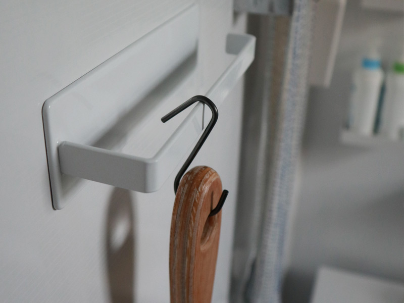 玄関では傘やお掃除グッズの引っ掛け収納にも。好みの高さにつけれるので、床の掃除もらくらくです。
