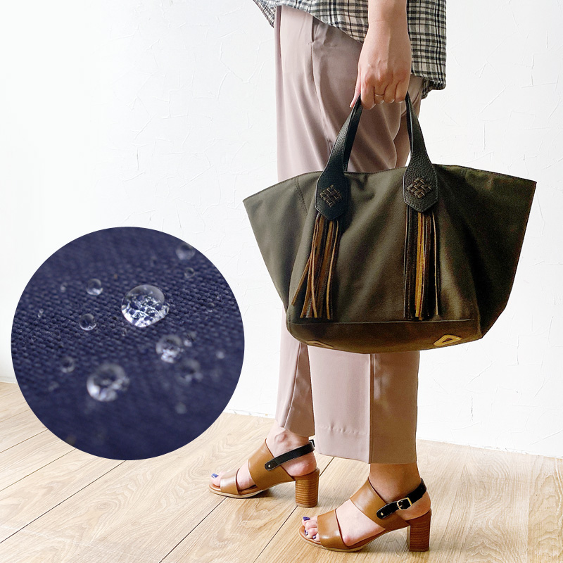 ⇒・撥水・軽量 フリンジ付ミニトートバッグ MICHIE(オリーブ)
