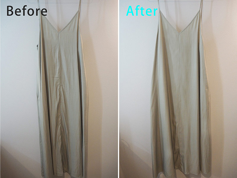 ハンガーにかけたまま、軽くピンと引っ張りながらスチームをあてるとシワが取れやすいです。