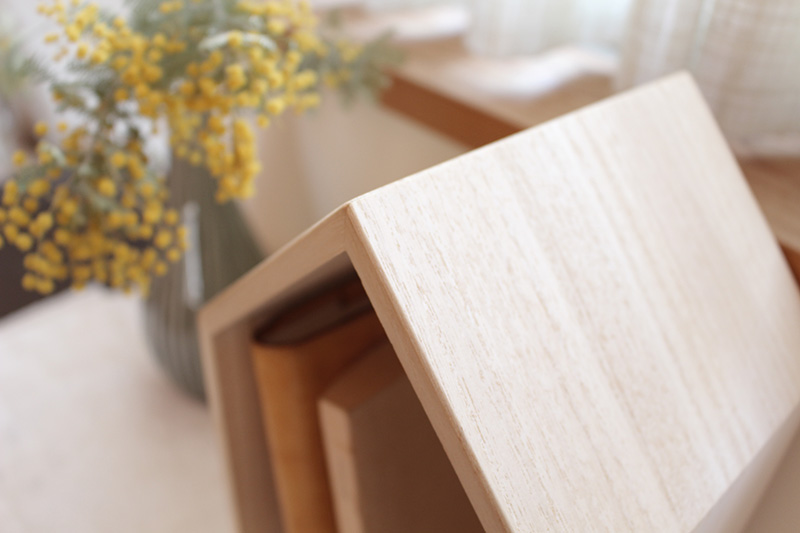 増田桐箱店の本の家は、桐の質感を生かしたナチュラルなブックエンド。手にした瞬間、木の香りがフワ~っと広がります。