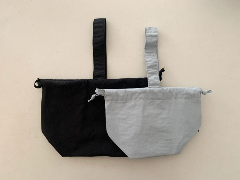 巾着袋のような薄地の形につくられているので、バッグの中でかさばらないところがいい。