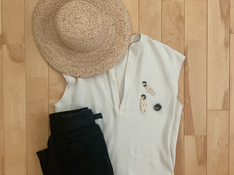 ブラックコーデがどこか柔らかいのは、きっとラタンのおかげ。