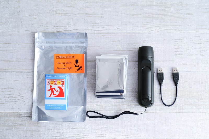 【ご紹介したアイテム】 付属のUSBケーブルでの蓄電はもちろん、手回しでも蓄電できるダイナモライト。保温性のあるアルミレスキューシートとセットになった、見せ置きできる防災グッズです。