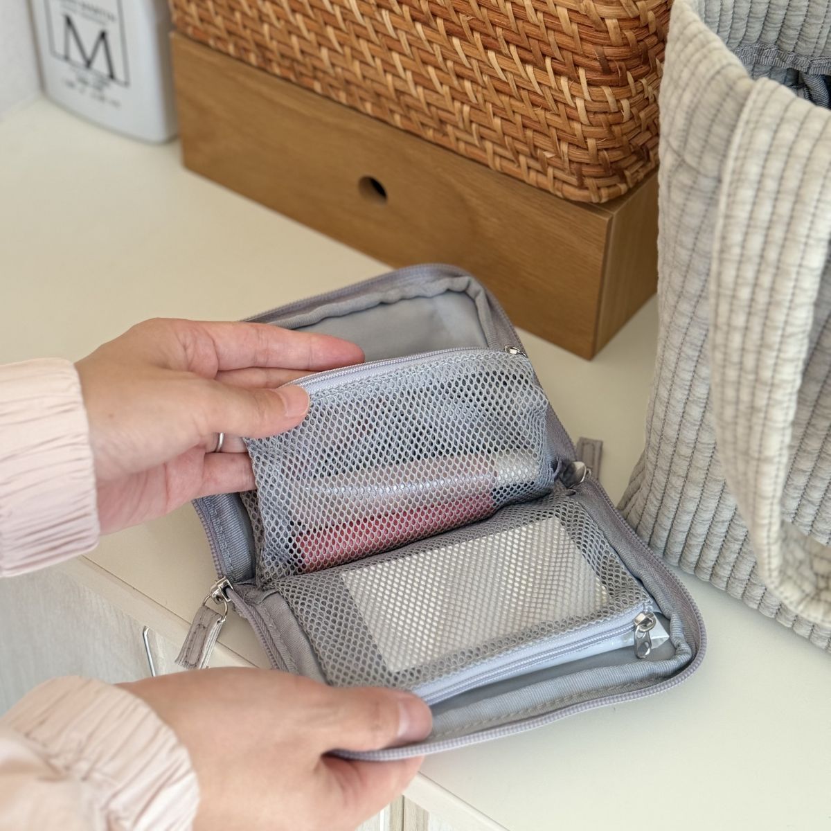 サイドバスケット クランパーは、テーブルに挟んで固定する収納アイテム。テーブルに散らかりやすいメモや筆記具といったお仕事道具はもちろん、耐荷重が1.2kgあるので、飲みかけの蓋付きタンブラーやコンパクト加湿器なども収められます。