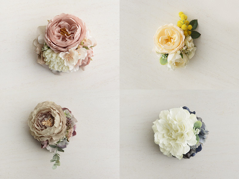 ブランド名に込めた「小さなポケットが幸せでいっぱいになるように」という想いを込めて、ひとつひとつ丁寧に作られたコサージュ。まるでフラワーアレンジメントのように華やかでありながら上品な印象です。