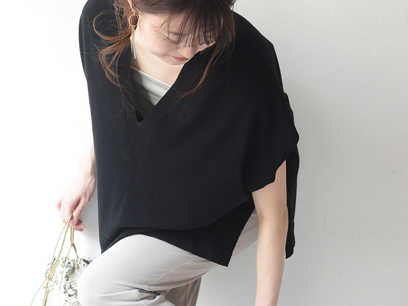 おすすめコーデ・・・淡色系トップス、Vネック、スキッパー、シアーニット、抜き襟、アームホール広めのトップスなど。