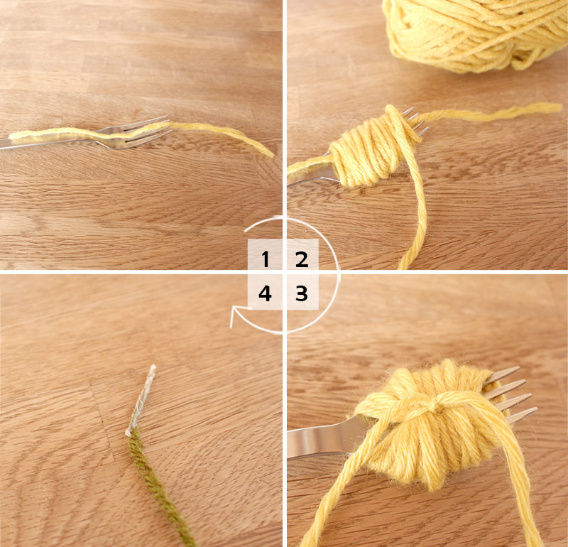 【1】15cmくらいに切った毛糸をフォークにのせます。