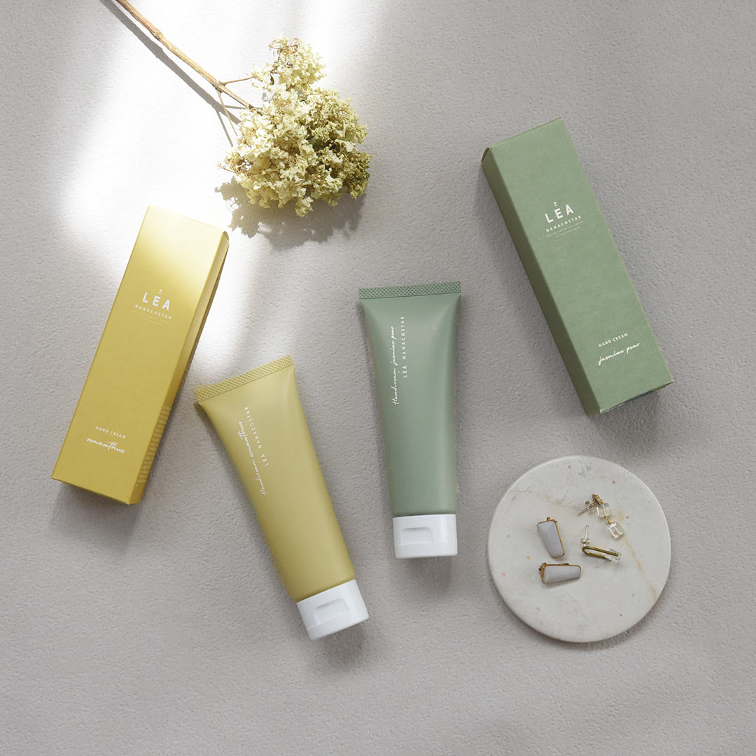 植物の恵みを贅沢に調合したLEA ハンドクリーム。手肌と髪の両方に使える2WAY。気品あふれるキンモクセイの香りを含む2つの香りから選べます。