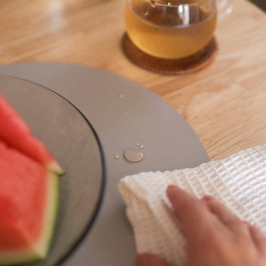 ランチョンマットを敷いておけば、うっかり食べこぼしてしまった時も安心。けれど布製だとその都度お洗濯が大変・・・そんなお悩みを解決するのが、洗濯いらずのフェイクレザー素材。