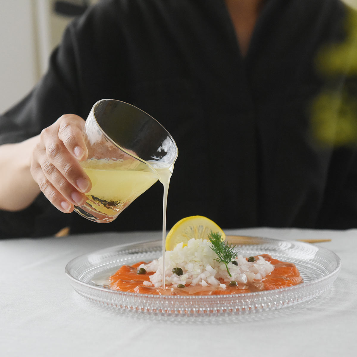 ガラスに槌目の凹凸をつけた「グラシュー」。光の屈折による陰影が涼やかな食卓を演出。ドレッシング、麺つゆ、冷酒を愉しむ片口としても活躍します。