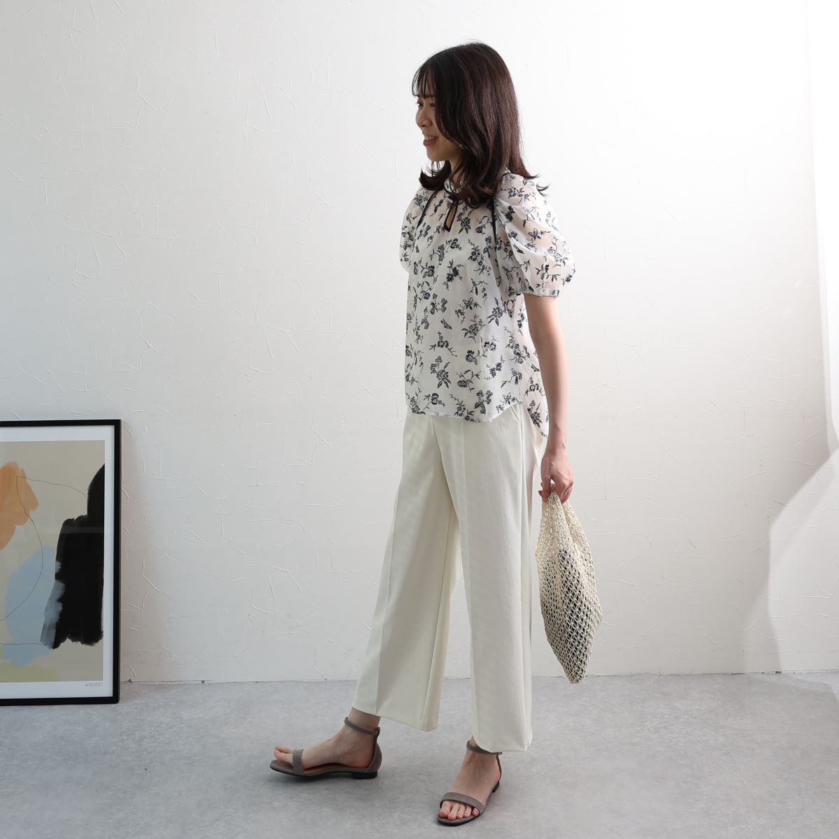パフスリーブがかわいらしい印象のブラウスにも、ワイドパンツはぴったりフィットしました。