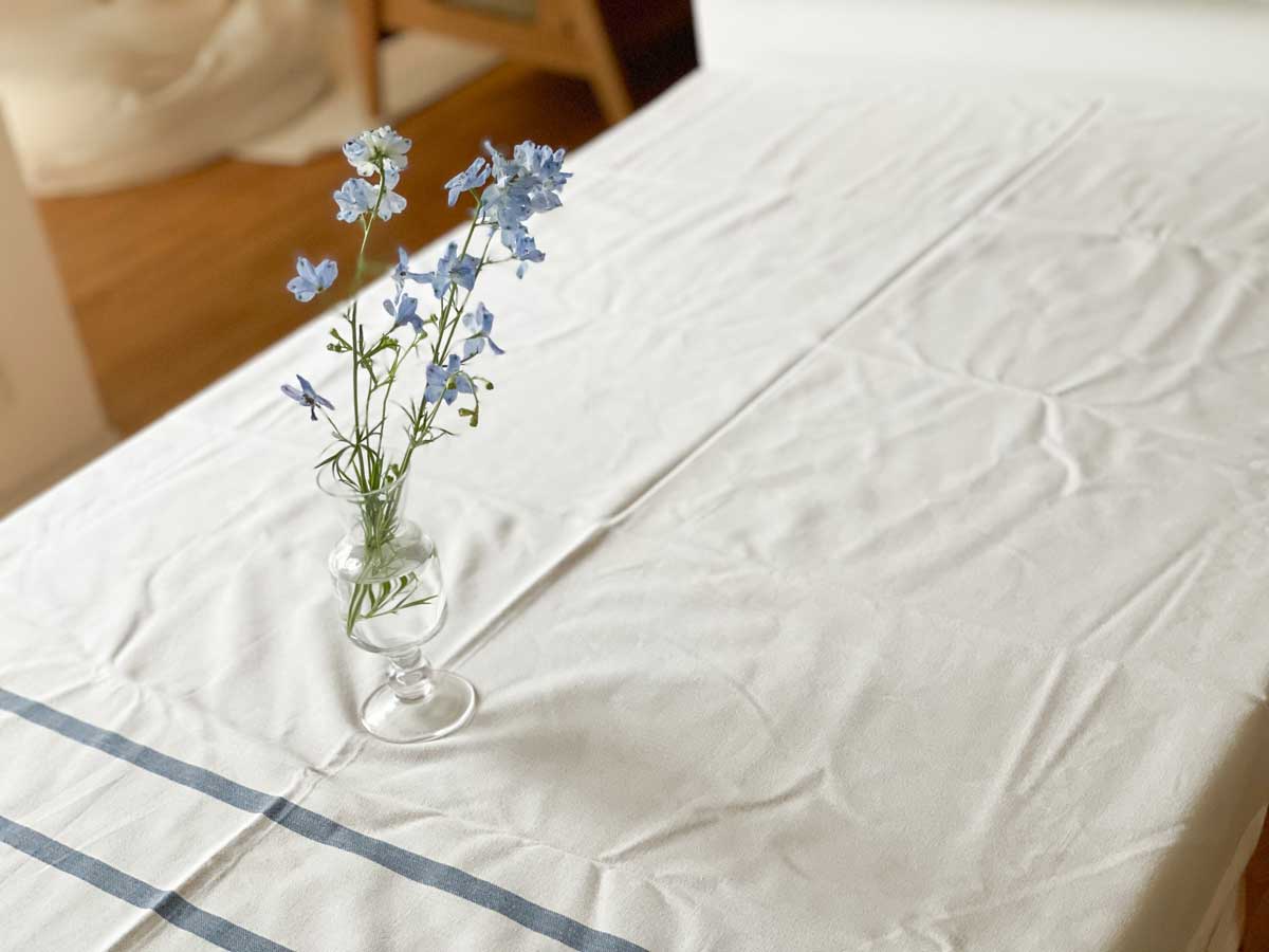 ブルーのテーブルクロスは、白い面積が多いのが特徴です。