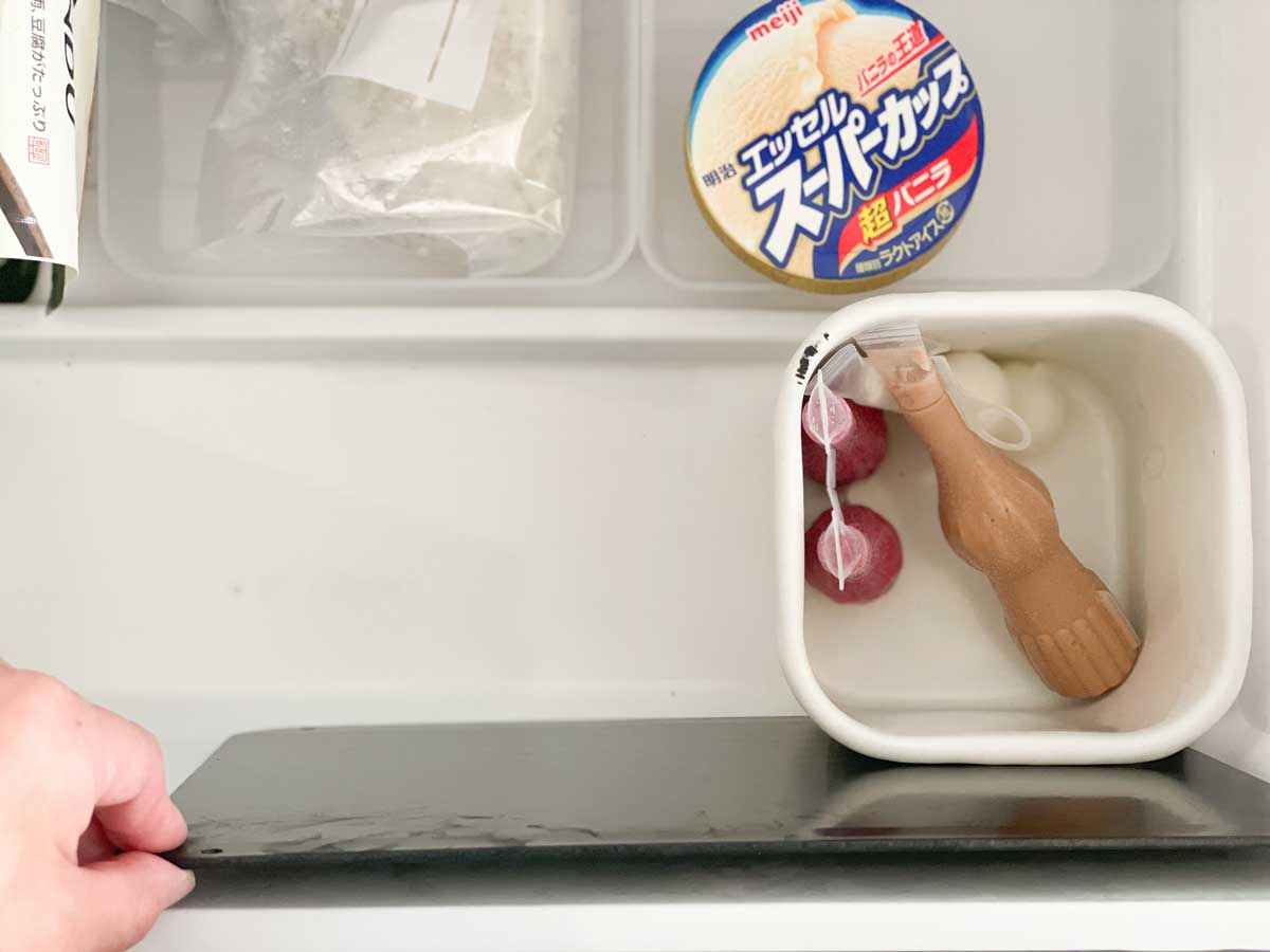 冷凍庫の引き出しを開けて、すぐ手前の隙間に立てて収納。