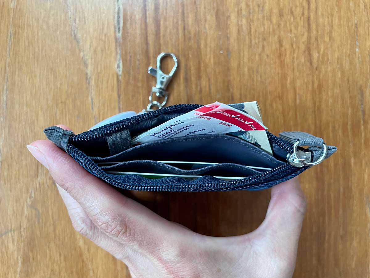 私は、表からも見える透明なポケット部分にSuicaを、もう二つあるポケットには、テニススクールの入館カード、チャージ用の千円札一枚と絆創膏をそれぞれ入れました。