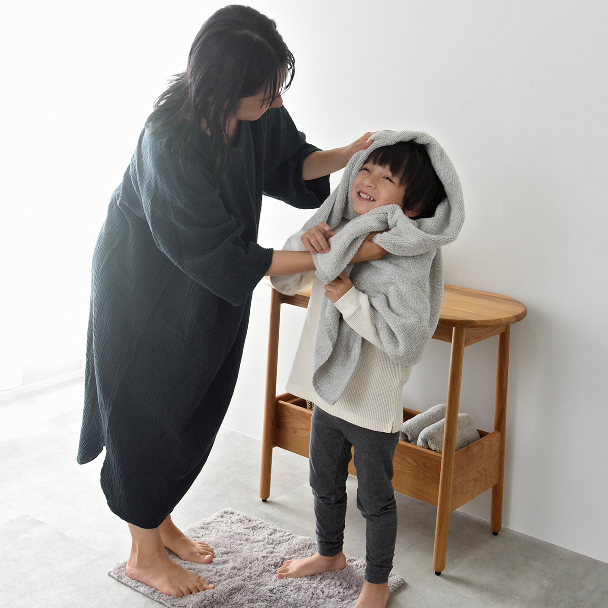 湯上りワンピースなら、頭からバサッとかぶるだけ。吸水性が高いから、多少拭き残しがあっても全然平気。時間との勝負のスキンケアや子どものお世話に、素早く取り掛かれます。