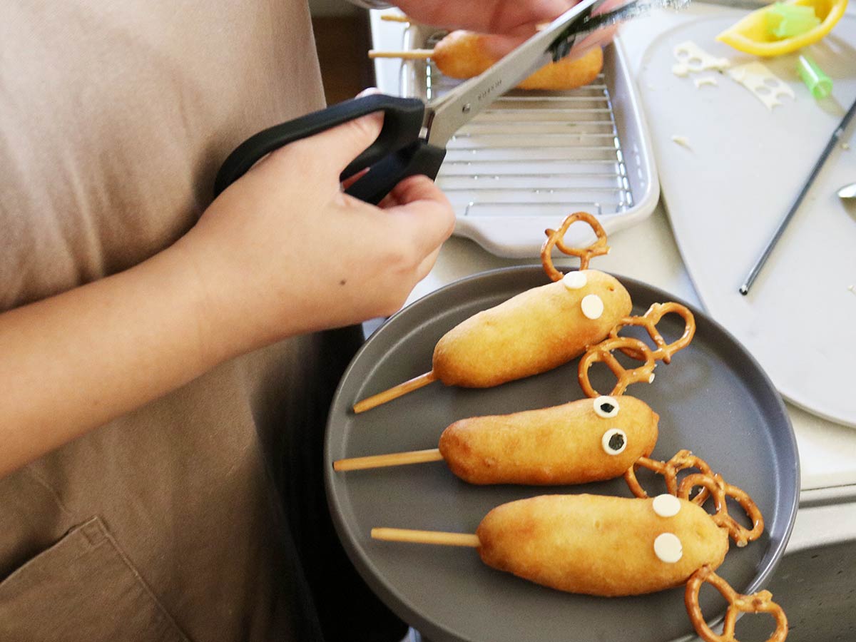 プレッツェルを、ツノにみたてるようアメリカンドッグに刺します。