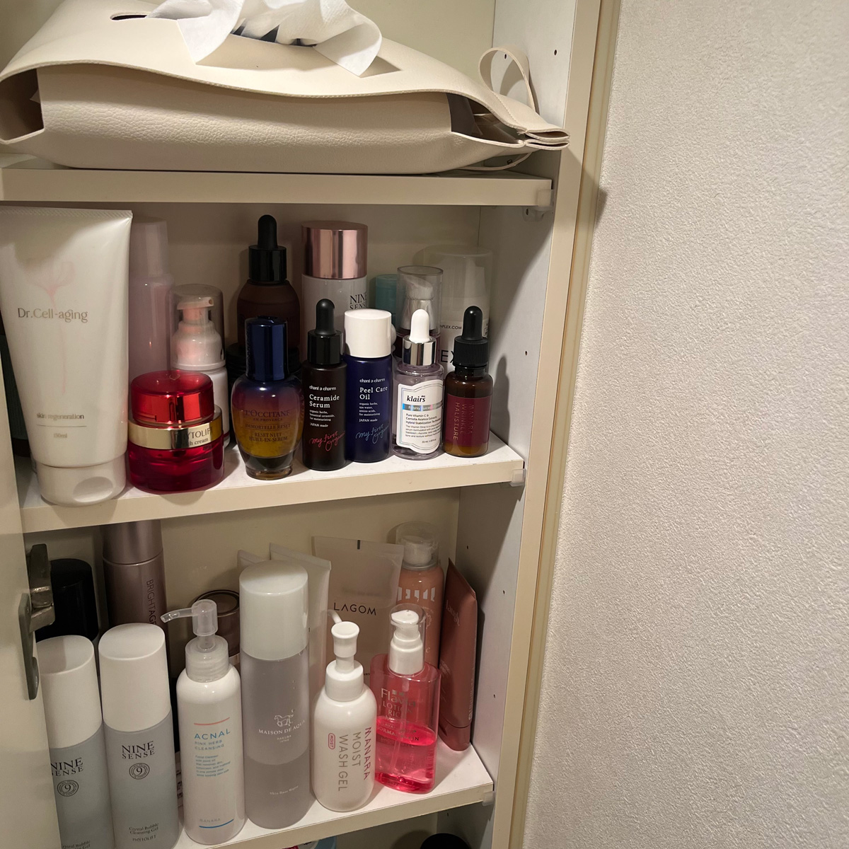 美容液を始めとしたスキンケア品をあれこれ試すのが大好きなので、収納棚はアイテムが溢れかえっています。