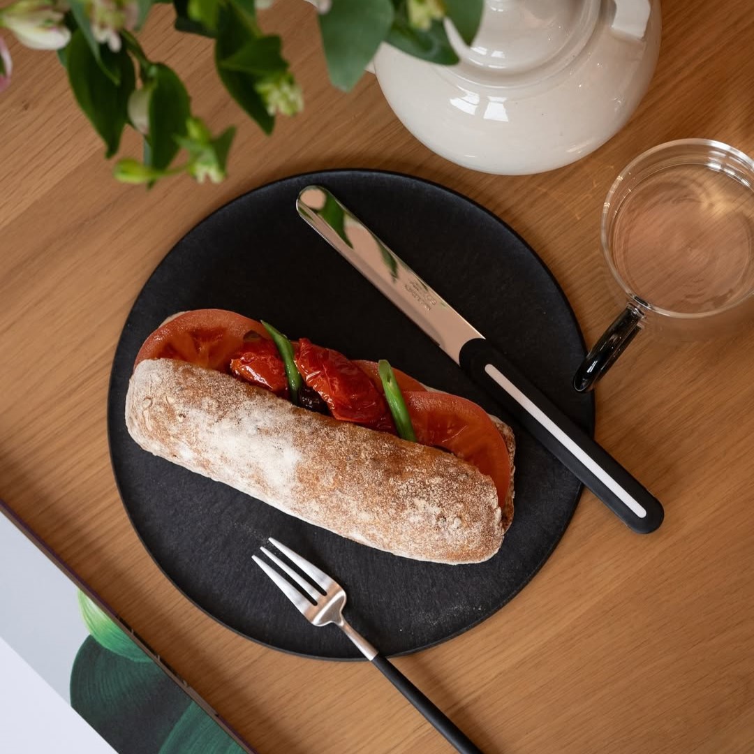 まな板として使えるプレート。フルーツやお肉、ピザトーストをカットして、そのまま食卓へ。スレートにも似た質感の黒いプレートは、お料理を美味しく見せてくれます。