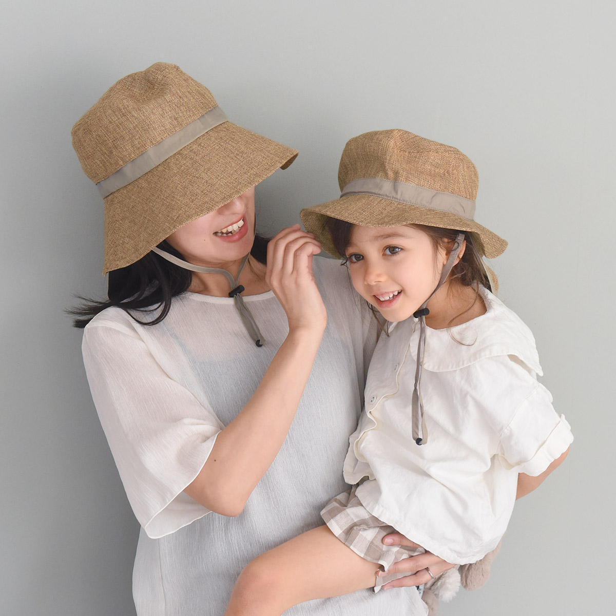 また多くのリクエストのお声から同じ素材で、少しデザイン違いの大人モデルのハットをご用意しました。こちらは長めのツバで深く被れるので、ママも一緒にしっかり日焼け&熱中症対策を!