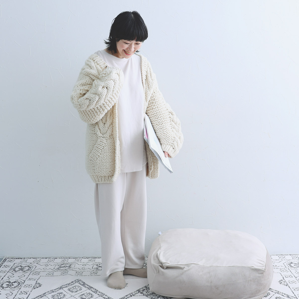 サイズ展開は、50-80cm/90-110cmの2サイズです。膝下までのゆったりサイズ感で着たり、お腹まわりを覆えればOKなサイズ感で着たり、お洋服と違ってサイズアウトはゆっくりめで長く着られます。