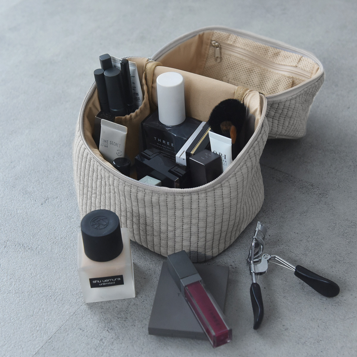 そんなときこのバニティなら立てたまま収納OK。普通のポーチのようにバッグの中でポーチが横になってしまうこともなく、安心して持ち歩くことができます。