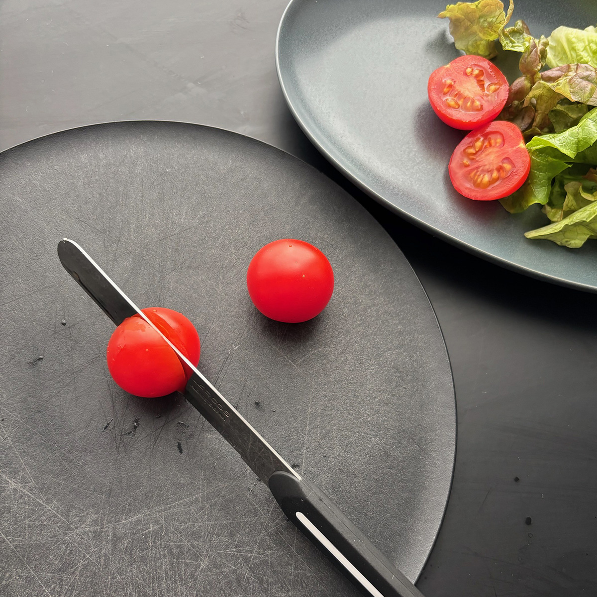 一食分の器を並べられる大きさ。幅広過ぎない半月型だからこそ、丸形のテーブルにも4人分をすっきり収めることができます。
